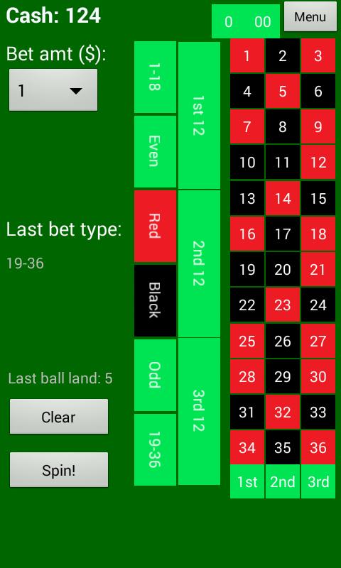 ประเภทการเดิมพันอาจเป็นตัวเลขที่แน่นอน, ตัวเลขคี่/แม้กระทั่ง, ดำ/แดง, 1-18 (ต่ำ)/19-36 (สูง) ครึ่งหนึ่งของตัวเลข, คอลัมน์ 1-3rd หรือหลายสิบ